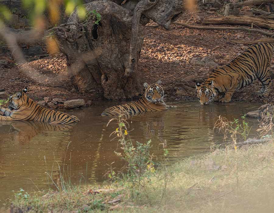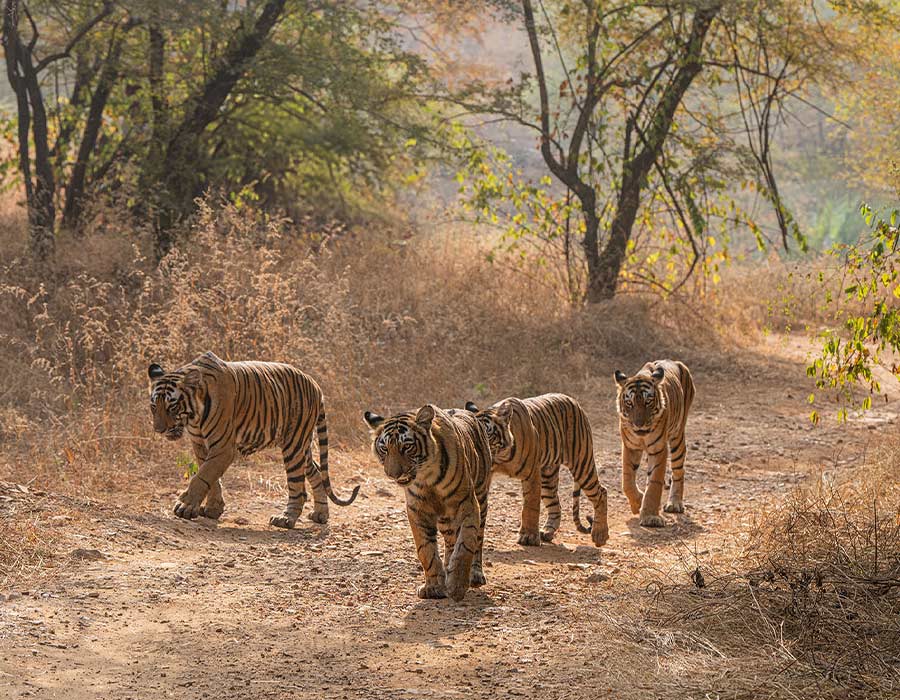 This trip gave us pictures we will treasure forever. We captured everything from the infamous intense look of a tiger walking straight towards the camera to the heartwarming sight of a tigress playing with her cubs by the water and other beautiful views. The golden rays of sunlight shining through the trees and the eternal beauty of Ranthambore’s vast landscape are nothing less than a piece of art.